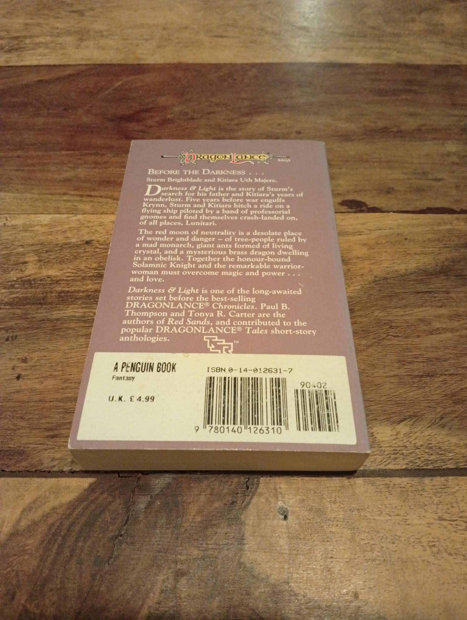 Darkness and Light is the story of Sturm's search for his father, and Kitiara's early mercenary days. Five years before war engulfs Krynn, Sturm and Kitiara hitch a ride on a flying ship piloted by a band of professorial gnomes and find themselves crash-landed on, of all places, Lunitari.